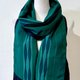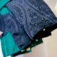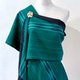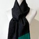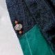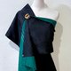這塊郵差綠的日本古董羊毛織布顏色非常飽和,質感也細緻紮實,只是靜靜的待在那兒,就能自帶光芒。這次把它和歐洲宮廷風的立體織布搭配,兩者像異國文化融合般有趣:深綠這面,黑色韻律像水面下沈穩又綿延不絕的律動;黑色這面,立體緹花織紋像生命中酸甜苦辣的經驗激盪出的火花。兩者纏繞交融,卻又以強而有力的力道前進。在不經意處有條可愛的金魚悠遊其中,象徵清澈的生命活源才有靈動的生命力祝福。