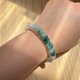 This bracelet centres around a soft misty green rose, paired with a gentle semi-bangle shape and rounded jade beads. The tones move between pale green, milky white and deeper forest shades, creating a quiet sense of depth — like light drifting across layered leaves.