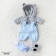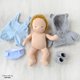 娃娃穿著棉尿布、棉質連身衣、針織連帽羊毛開衫和鉤針短靴。