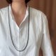 細身でダーク色のネックレスですが、黒系のシャツの上でも、マルチシルバーの柔らかい輝きと、キラッと輝くオニキスの光が合わさり、さらっと上品に存在感を出します。