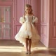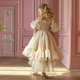 She wore a luxurious champagne-colored organza dress (also available in white, light ivory, and ivory), which embodies a fairy-tale aesthetic. The dress has an open neckline with large, soft puff sleeves made of sheer, lightweight fabric, creating a delicate, airy volume. The bodice is form-fitting and smooth, emphasizing the waist, while the skirt flows into multi-layered cascading tiers of semi-transparent organza. Each tier ends with wide rounded ruffles that beautifully reflect the light, giving the dress a flowing, cloud-like appearance. The hem is asymmetrical—shorter at the front, revealing the ankles, and elegantly elongated at the back, forming a thin train (the train in this model is removable).