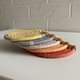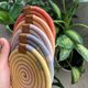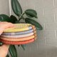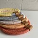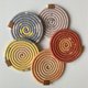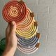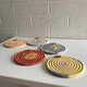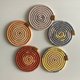 -Multicolored Set of 5 mug coasters, made of cotton rope coiled and stitched with colored threads.