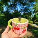 Handmade plant pot. A black cat clinging on a cherry cup with green handle ๐ D I M E N S I O N ๐ - 3.5 inches diameter - 2.8 inches deep - from the left side to the handle is 5 inches wide - the cat’s ear are 3 inches from the ground - we will send the pot safely packed with air bubbles and styrofoam 100% handcrafted pottery, fantasy animal theme plant pots for cactus succulent and other small house plants - Made with pottery clay, high firing at 1000 Celsius - Handpainted with Acrylic Paints - Epoxy Resin coated finish - drainage hole at the bottom for excessive water, for a better environment for the plant to grow in **Not Ceramic****** ๐ Shipping Information ๐ - We ship this item from Thailand worldwide by Thai post. You can receive this product within 7-14 business days for standard shipping ๐ RETURN AND EXCHANGE POLICY ๐ -please film a video showing the unpacking process to claim damage caused by shipping -We are responsible for any damage from the shipping process. (with evidence that shows it broken by our packing process )