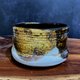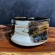 This chawan was wheel thrown from my small rooftop studio where I am now writing this description. I look out at the Yamingshan mountains and draw in a breath. This tea bowl was made from Japanese porcelain clay. I painted glaze on this piece. I also dusted wood ash over sections. The pot is unique as the glaze application was varied. The inside is glossy but the outside is a combination of matte and slightly 'rough'. While still wet I hand altered the shape, providing a more comfortable drinking experience. My seal is stamped at the base of the pot near the trimmed foot ring. I make pottery to hopefully add pleasure to someone's daily life. That is the feeling that motivated me to create functional items out of clay. Be the owner of a handmade tea bowl from the beautiful island of Taiwan. Detailed dimensions: Holds 480 ml Height: 8 cm Width: 12 cm