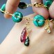 孔雀石色正而勻,紋理美,主飾紅碧璽花苞墜(富貴)、藍碧璽古錢、綠碧璽福瓜(財富),寶石冰透水潤、水光極強,整體華美富麗、風韻細膩。