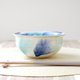 我們選用具有樸實氛圍的細膩白陶土。 將其塑形成具有深度的圓碗,施上光亮的白釉,再用數種藍色和綠色釉藥施作圖案。 經過燒製,釉藥相互交融,呈現出淡雅夢幻的色彩。 這是一款充滿韻味的器皿,從不同角度觀看,都能欣賞到不同的景象。