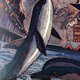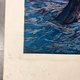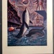 - In this lithograph big dolphin splits the water surface, its form rendered in detail against a background of textured crosshatching. Next to it, a smaller dolphin floats playfully, creating a dynamic center of attention. The spectators lean on the railing and watch the water show with interest.