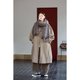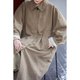 大翻領,寬闊的模樣,超級脫俗,因為足夠大,所以翻下來的形態有空餘量,很優美,再一圈點綴的線跡。然後是大落肩袖,一直落到小臂,拼縫有撞色線點綴。把袖子的量做大一點,到了袖口你可以折一圈,露出裡面的暖白色也很好看。