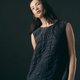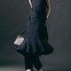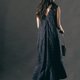 UUIN運用了對未接觸肌膚的空氣剪裁方式,令整件洋裝至下擺魚尾,都在特殊托特格紋理上,產生動人的曲線,嫘縈布料本身的反光特性在深藍基底上散發絕美典雅的氣質。