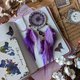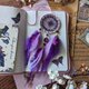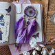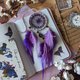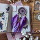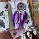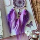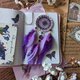This light purple dreamcatcher is made of feathers, a metal hoop wrapped with cord, sparkling glass beads.