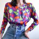 復古霓虹色抽像印花襯衫,彩色襯衫,幾何印花上衣,背扣。