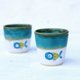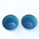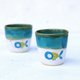 艶消しのターコイズブルーの釉薬を内側と外側の半分に掛け、残り半分に掛けた艶消しの白釉に表情の違う青い金魚を三匹描いたカップです。