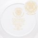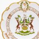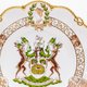 🔸盤中飾以 德比郡市徽(Coat of Arms of Derby),由兩隻雄鹿守護中央盾徽,象徵「勤勞、勇氣與堅毅」(Industria, Virtus et Fortitudo)。上方以月桂花環環繞女王側影肖像,下方金帶飾紋展現古典平衡感。外圈以卷草金飾圍繞,手繪描邊的浮雕式金彩在光影下閃爍細膩,襯托盤緣的鏤空弧邊設計,極具立體層次與皇家風範。