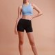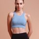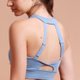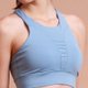 此款為高領削肩款式,前領綴有asana細緻手工設計pleats小摺子,背部為asana特色扭結加上可調式π型肩帶,胸下圍同樣是寬版不勒肋骨的長版運動內衣形式。