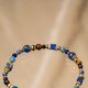 青金石以深藍色為主要的基底色調,並因內含母岩方解石而生成的白色紋路,其金色點狀的圖樣是因礦石中的黃鐵礦和鉻而形成,表面如星空般,充滿奇幻並豐富的色彩。主要由藍色礦物組成的綜合體,數千年古埃及人就發現此天然石,不僅使用於珠寶飾品設計中,也因其色彩及成分而作為繪畫的顏料,其色彩稱之為"群青藍"。