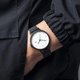 表盤去掉多餘裝飾:僅保留細黑指針、數字刻度與,白底 + 銀殼的搭配像一張干淨的畫布,讀時清晰又不搶風格,隨便搭 T 恤或襯衫都能融成整體。
