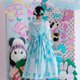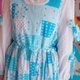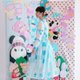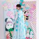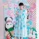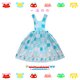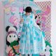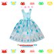有兩重花邊搭配,印花圖案上身沒見位置會有所不同,裙擺有裡布,兩側有口袋。腰間有綁帶,可前後面穿著,上身正反面不同設計,下邊圖案是穿藍色服裝的小動物撐傘雨中漫步。