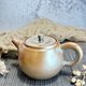 天然落灰在壺面上留下如晨霧般的銀光與微光閃爍的金紅交界,展現獨一無二的火痕紋理。壺嘴短而圓潤,出水俐落,與穩重的壺把一氣呵成,構成簡潔又具有存在感的構圖。