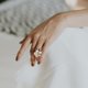 強烈的綠色肯蒂亞葉子高舉精緻純潔的雞蛋花。精準的簡單線條,構成戒指和手鐲上優雅的纏繞設計,依稀喚起未受污染的森林,鬱鬱蔥蔥的植物和野生動物的呼喚。不意外的,看到鱷魚出現,欣欣向榮的綠洲,恢復到地球最原始自然的完美居民。白色的瑪瑙與石英,以及其他相關色調的粉色與黃色,散發出平靜與詳和的氛圍。