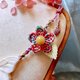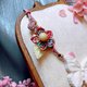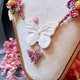 花朵的編織部分採用段染線,炫目的粉色與碧藍色交織而成,形成色彩繽紛的五瓣花,將凜冽的設計感與女性的柔美完美結合。項鍊繩則運用豆沙粉和藕粉的色調,層層疊疊地展現不同深淺的粉紅色彩,讓整體設計更具層次感,也使得粉白色的岫玉蝴蝶更加突出,成為整體的視覺焦點。