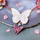 粉白岫玉蝴蝶白葉彩花編繩項鍊是一款以古典美學為靈感的首飾,融合了自然與手工藝的精緻。此項鍊的主角是粉白色的岫玉蝴蝶,岫玉是四大名玉之一,具有豐富微量元素,能舒緩壓力和促進睡眠。粉白色的蝴蝶設計宛若翩翩起舞,翅膀上的浮雕花紋如水面波紋,柔和而典雅,令人愛不釋手。