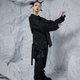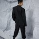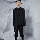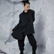以正式短版西裝為基礎,將正式西裝與洋裝下擺解構重塑後,由前、後片展開版型並延伸出來的垂墜下擺,打造出兩側下擺的不對稱層次感,並在身片上附有調節式織帶插扣,做為點亮層次的筆觸,並實際做為束縛垂墜擋片的功能,用以改變整體穿搭造型;正面配置兩個實用口袋,背後做了開衩細節,在活動上不只更加方便,也能防止西裝下擺過於包覆臀部造成過多的皺褶。