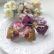 大腸圈結合棉布和素色織帶,上頭以韓國進口織帶做成自行發想的扭結、加上pu皮繩做裝飾,費工但成品很扎實立體,色澤也挺有日式古風的感覺~