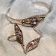 實際上這樣造型的組合,可追溯到數個不同文化。像是肚皮舞孃、在印度皇宮後院眷養的女子們、還有重要的結婚場合,都會搭配這樣的飾品。印度人給它的名字要美多了,「手之花」(Hand flowers) 有人可以翻譯得更美點嗎? 描述這樣的飾品戴在手上,宛若花朵般美麗,令人目不轉睛,是不是很傳神呢 ~