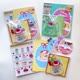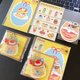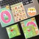 甜點透明貼紙一張、雙面甜點明信片一款、甜甜圈行李箱大貼紙三張、布甸/果凍搖搖樂鎖匙扣一個(附明信片和貼紙)