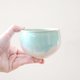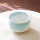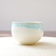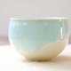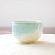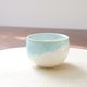 ころんと丸いお湯のみの形に成形後、全体に艶やかな白い釉薬をかけ、さらに水色の釉薬を重ねがけしました。