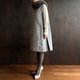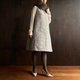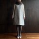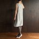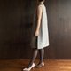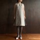 ノースリーブのAラインで、膝丈(着用モデルは身長157m)のコンビネーションドレスです。ネックラインは、前後ともボートネック。後ろボタン(1個)で着脱します。ライトブラウンの総裏地付き。