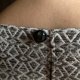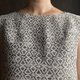 幾何学的なフラワーパターン、フランス製の光沢のあるジャガード生地(ポリエステル50%/コットン50%)。ファブリック生地なのでやや固めですが、総裏地なので肌触りはスムーズです。前身ごろ胸元に左右2つのダーツが入っています。
