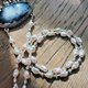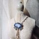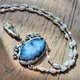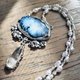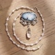 樹枝蛋白石與白幽靈水晶項鍊,金屬材質為925銀與999銀,整體尺寸(長x寬,包含主墜飾與下方垂墜)為70x46mm。搭配50cm造型配鍊(不可拆),材質為巴洛克珍珠、藍光月光石、999銀碎銀配件,內部線材為日本製鋼絲線,扣頭與配件皆為925銀。