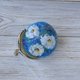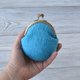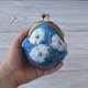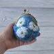 帶有吻鎖的蒲公英氈小零錢包是用羊毛用濕氈技術製成的,而圖片是用氈水彩畫技術貼在上面的。
