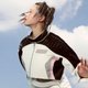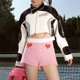 - 在夾克的版型上加入立領的設計,夾克側部的灰色粉色黑色的撞色拼接,使服裝看起來更具有少女運動感。短款外套在底擺處設有可調節腰帶的設計,可根據試穿者的需求自由調節長短。運動感強,是少女出街必備外套。