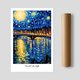 《橋上星夜 Starry Bridge》承襲梵谷式的渦旋筆觸與濃烈色彩,畫面捕捉了夜空、河水與橋梁的交響。滿月與繁星在深藍的天際閃耀,城市的燈火沿著橋墩綿延,映照於水面上形成金色波光,彷彿音符般躍動。藍與黃的對比強烈卻和諧,營造出浪漫而夢幻的夜晚氛圍。
