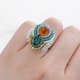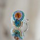 指輪を作るとき、まずメインのビーズを決めます。 そのビーズを引き立てるように隙間なく刺繍をすると、カラフルでにぎやかで、まるでおしゃべりをしているような指輪に仕上がります。 そんな指輪を付けて出掛ければ「その指輪なあに?」とさらにおしゃべりが広がることでしょう。 そうなったらいいなと思いを込めて作ったおしゃべりな指輪です。 飾り部分のサイズ:直径2,5㎝ 指輪のサイズ:フリー(ご自分で調整いただけます) 重さ:約5g 素材:ビーズ、天然石等 ケースは付いていません。小さなオーガンジーの袋に入れてお届けします。