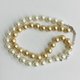 こちらはガラス素材の原玉に、オリジナルパール塗料にて何層にも渡り重ね塗りを施した日本製ガラスパールネックレスになります。パールの間1つづつ丁寧に結び目を入れたオールノット加工にて仕上げました。きめ細かい質感と程良い艶感のホワイトパールとアンティーク調のゴールドパールを左右に配置したバイカラーネックレスになっております。パールサイズは直径約8mm玉で、長さは標準的なプリンセスサイズの全長約43cmとなっております。テールエンドにアジャスターを付けていますので、約5cm程の調節が可能です。