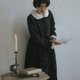 圓領+蕾絲花邊,乖巧可人。 上身啞光西裝面料,相遇絲絨暗紋裙襬。 輕盈之間,藏著細膩的層次。 單穿是玫瑰輕落的黑色古董裙。 疊穿「古董娃娃領裙」,木耳花邊描出浪漫,就多了幾分復古美學。