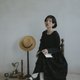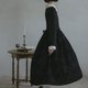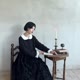 黑色 夜鶯玫瑰小黑裙 蕾絲花邊圓領洋裝 暗紋絲絨復古連身裙