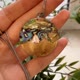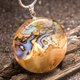 這款圓形吊墜由樺木瘤、透明樹脂和天然天芥菜製成,在光線下閃閃發光。附有項鍊。