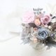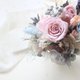 永生花紫粉玫瑰(大+小)、永生花藍色玫瑰、尤加利葉、白色永生繡球、紫色永生繡球、藍色飛燕、小風鈴、藍色虎眼、白色小星花、白色苔蘚草、白樺木