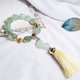 主飾以葡萄石雕招財神獸-貔貅,彎曲體態盡顯生動、療癒可愛。相佐琺瑯福字(福氣)、祥雲(清淨)、花(富貴)等飾物,編製華美鍊身,襯以金黃冰絲流蘇,金、綠交織掩映,大器富貴非凡。