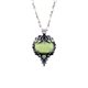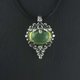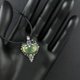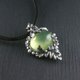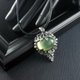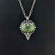 以復古的藤葉造型浮雕裝飾一顆重達18ct的青蘋果綠色葡萄石,蛋面切磨相當飽滿,點綴鑽切的無色拓帕石。