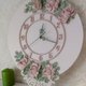The pink wall clock with roses is completely handmade on the basis of plywood painted with acrylic paint. The clock is decorated with roses made in the technique of three-dimensional painting.