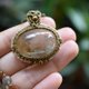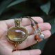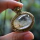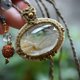 水晶の中に気泡とゴールドカラーの結晶体が入り混じっているガーデンクォーツ 。石の透明度、中からうかがえるシラーはとびっきりの代物。シンプルにマクラメ編み装飾を施してペンダントに仕上げました。