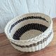 這款小物收納籃由天然藤材與染色成黑色的竹皮手工編織而成。
