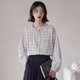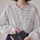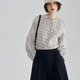 寬松格紋襯衫,定制格紋色織面料,擁有質樸的光澤質地,截短式寬松衣身,直身顯瘦,兼具骨感與柔軟,立體的肩部剪裁,上身即可挺立有氣質。 小圓領領口系帶,有少女的俏皮感,弧線順滑的花邊,從領口直至袖口傾瀉而下,營造復古慵懶的氛圍。