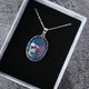 深い群青色が美しい天然石「ラピスラズリ」に、秋の花・コスモスのモチーフを添えた上品な楕円形ペンダントです。