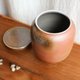朱泥色澤來自柴燒工藝的自然呈現,壺身散發著深沉且溫潤的美感。茶倉蓋子設計緊密,確保茶葉不受潮,保持新鮮。陶土的毛細孔讓茶倉透氣良好,不會悶住茶葉的香氣,提供最佳的儲茶環境。